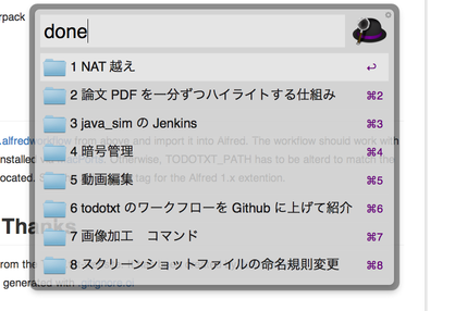 Todo.txt を扱う Alfred Workflow は既にあるっぽいですが、 Alfred のせっかくの機能を十分に活かしきれていなかったみたいなので、 自分で作ることにしました。ただのシェルスクリプトだし。